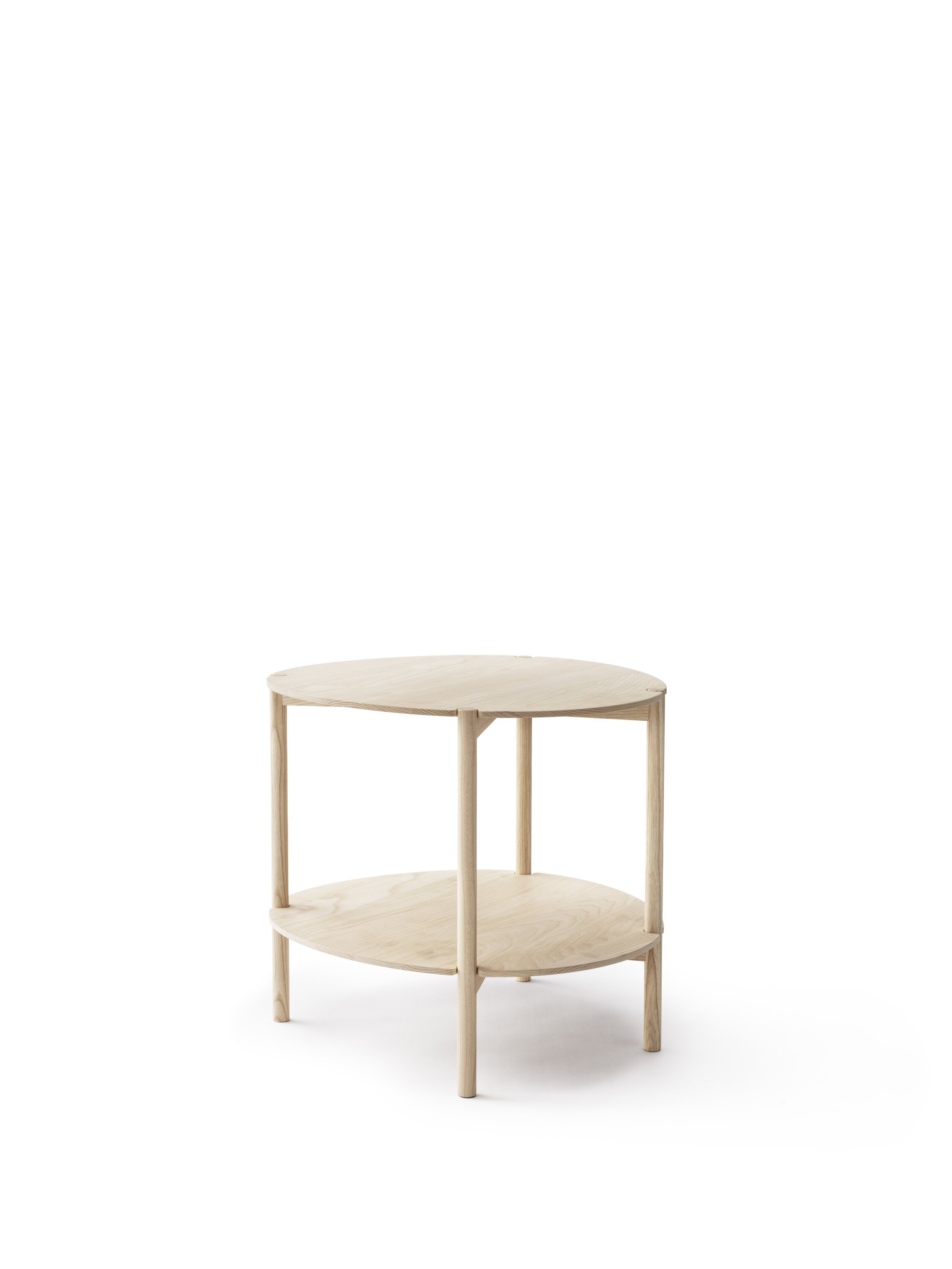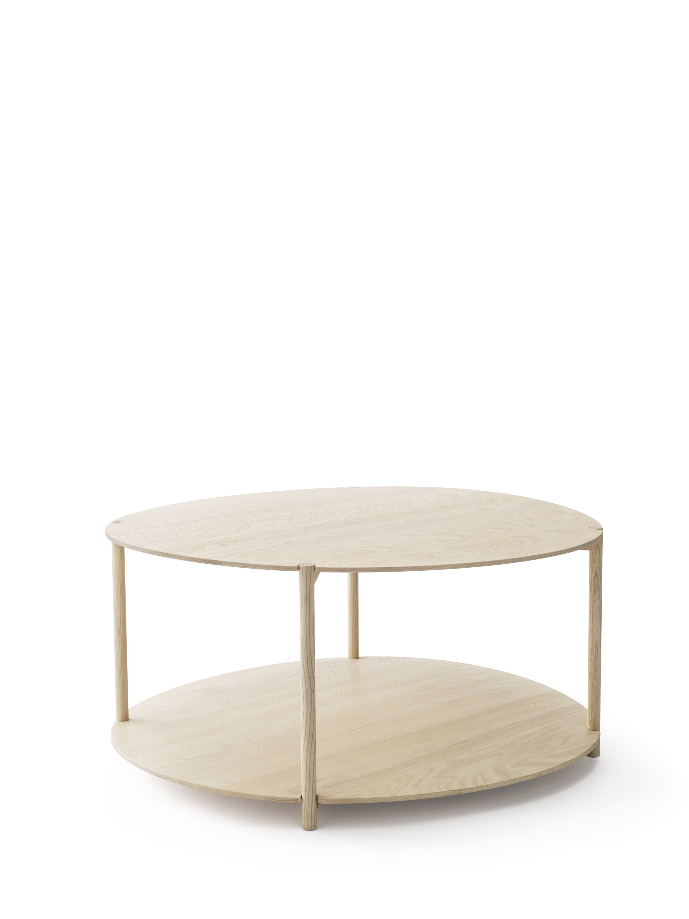 The versatile table, low, with soft lines and warm wood.